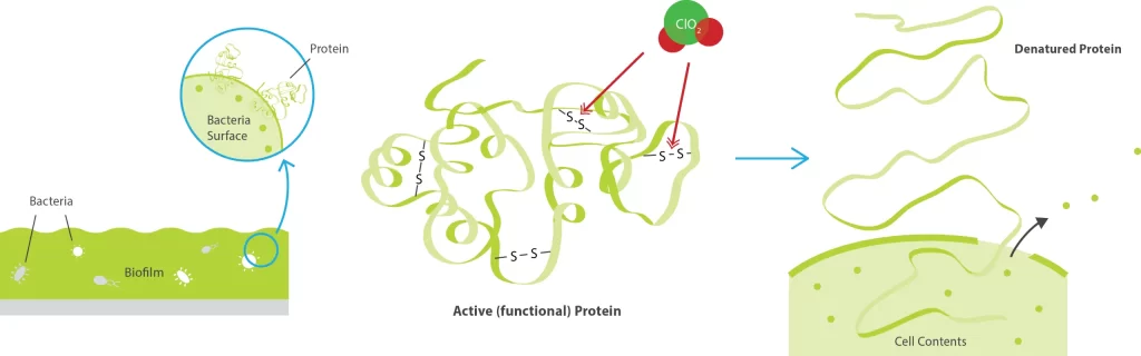 Many biocides have particular problems in penetrating this biofilm, due to the polysaccharide “glue” that is secreted by bacteria such as Pseudomonas to hold the biofilm together. Unlike most biocides, chlorine dioxide can effectively penetrate the polysaccharide layer of biofilm without being used up in reacting with the inert sugars. This allows the ClO2 to act on the bacteria themselves, destroying the biofilm.